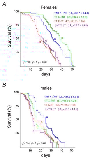 Significant differences were found between the four treatments for the longevity of the newly emerged and virgin female (Log-Rank test, χ2 = 70.81; df = 3; p < 0.001; Figure 3A) and male (Log-Rank test, χ2 = 21.40; df = 3; p < 0.001; Figure 3B) flies under different schemes of exposure to LC20 of the eucalyptus EO. Median survival time (LT50) ranged from 37.71 to 21.70 days for females and from 15.52 to 24.62 days for males. Females from couples where only the female was exposed (♀T x ♂NT) lived significantly longer than the females from the control couples (♀NT x ♂NT) and other couples (♀NT x ♂T and ♀T x ♂T), while males of the control couples (♀NT x ♂NT) presented the highest longevity compared to the other combinations.