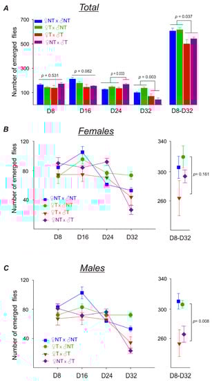 When the aggregate of the numbers of adults emerged during the whole experiment (Days 8 to 32) were compared, significant statistical differences were found for the total (females + males: F = 3.581; df = 2; p = 0.037; Figure 4A) and for male (F = 10.787; df = 2; p = 0.008; Figure 4C) but not for female (F = 1.961; df = 2; p = 0.161; Figure 4B) flies produced. The couples where only females were exposed (♂T x ♀NT) performed equal to the controls (♂NT x ♀NT) and produced the highest numbers of flies.