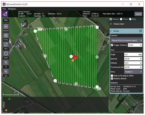 Graphical interface of QGroundControl with an example of the mission’s waypoints map. Source: www.qgroundcontrol.com, accessed on 27 March 2022.