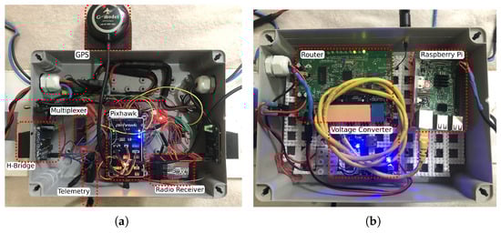In addition to the Pixhawk and the GPS module, the robot’s control system also has an H-bridge (model Bts7960) and multiplexers (model CD74HC4067) used to convert the output of the Pixhawk to command the H-bridge. Moreover, the remote control receiver module and the on–off switch button for activating control via Pixhawk are placed in the control system case. Figure 9a illustrates the control system case.