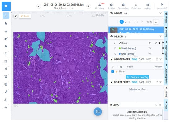 Image annotation was performed using the supervise.ly platform [] (version 6.4.31), which is a Web platform for computer vision data annotation. Many annotation tools are available in the supervise.ly interface for effective semantic segmentation, including cuboids, polylines, bitmap brushes, bounding boxes, polygons, and keypoints. Figure 12 illustrates the graphical user interface of the platform and the result of a semantic segmentation case of the annotated images. The process was carried out in stages, where the first 10 images were manually annotated, and later the Deeplab-v3 model [] with pre-trained ResNet 101 backbone in the COCO dataset [] was adjusted with the annotated images using 224 × 224 pixel patches. The inferred images were uploaded back to the platform for correction. After 10 corrected images, the process was repeated to increase the inference quality. After three cycles, no further improvement was noticed, so the rest of the images were manually corrected.