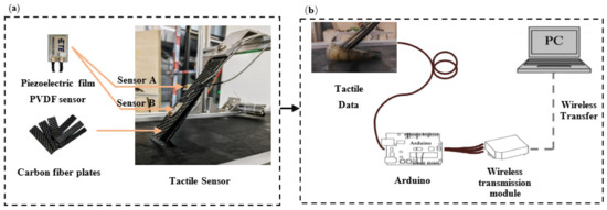 In this study, a tactile sensor was developed. When the tactile sensor slides across the surface of an object, it senses the surface texture and hardness information of the object and transmits signals over time through two sensing cells. The tactile sensor consists of four carbon fiber plates (Zesheng Carbon Fiber Products Factory, Zhongshan, China) and two piezoelectric film polyvinylidene fluoride (PVDF) sensors (Jiangmen Antai Electronics Co., Ltd., Jiangmen, China). The fabrication of the tactile sensor proposed in this study is simple, as shown in Figure 1a.