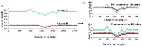 The raw signal plot is shown in Figure 2a. The blue waveform represents the data acquired by Sensor A, i.e., the shrimp surface texture information. The red waveform represents the data acquired by Sensor B, i.e., the shrimp hardness information. During the dynamic process of data acquisition, the raw output signal contains a DC component, which leads to a nonzero starting signal and different starting values for the two sensing cells.