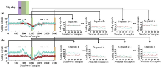 Tactile signals are directly used to train the model to recognize different objects by undergoing a complex learning process that ignores the detailed feature information about the surface texture and hardness [27]. The segmentation of the preprocessed tactile signal can tap into the details of the tactile signal, and reducing the signal length to process at each instant while keeping the signal characteristics [28]. The sliding window method was used to segment the data with a certain step size to ensure data continuity after segmentation. The effects of data segmentation are shown in Figure 3a,b. The number of segments is calculated by