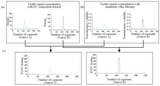 To reduce the interference of DC components in feature extraction, two tactile signal preprocessing methods were used. These are the direct filtering of the DC components from tactile signals when extracting energy features, and the minimum value filtering of tactile signals when extracting nonstationary volatility features. The specific raw signal processing is expressed as Formulas (1) and (2).