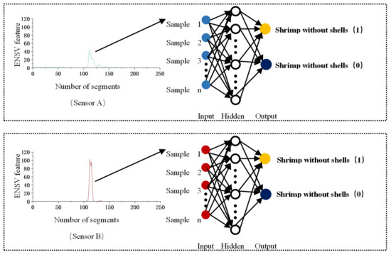 We pretrained the model using shrimp with and without shells as prior knowledge. This enables more respective clustering of the ENSV feature vector distributions of shrimp with and without shells. Artificial neural networks were used to classify the feature dataset [29]. In general, BP neural networks do not have strict data distribution requirements. These can automatically transform the initial “bottom” feature representation into the “top” feature representation through multilevel and nonlinear transformations [30]. This part uses ENSV as prior knowledge for the pretraining process. The data from Sensor A and Sensor B are trained separately. The number of neural nodes in the input layer corresponds to the number of segments of the samples. The model input is the ENSV feature vectors extracted from the sample. The number of neurons in the hidden layer is 10. The number of neural nodes in the output layer corresponds to whether the shrimps have shells (1 for shrimp with shells and 0 for shrimp without shells), as shown in Figure 5.