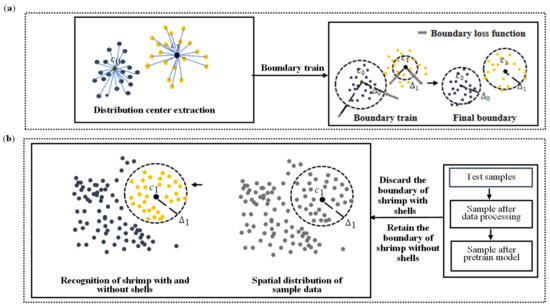 As mentioned in the introduction, shrimp with shells have complex shell attachment sites. Therefore, we propose an ARBM to solve this problem. First, the ENSV feature vectors were pretrained using a back-propagation (BP) neural network fitting model, as shown in Figure 5. Then, the feature vectors of shrimp samples with and without shells were assumed to be located in different circular regions, and the center of each class was calculated, as shown in Figure 6a. Finally, the radius of the recognition boundary was obtained by training. The recognition boundary of shrimp without shells was retained, while that of shrimp with shells was discarded. The shrimp with and without shells are located outside and inside the boundary, respectively, as shown in Figure 6b.