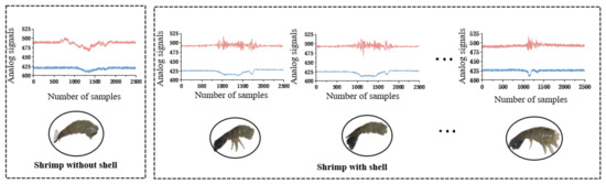 The tactile sensors described in Section 2.1 were used to acquire tactile data from the shrimp. All samples were placed on a conveyor belt moving at a speed of 0.1 m/s for tactile data acquisition. Taking into account the distance between the end of the tactile sensor and the laser sensor, data acquisition starts 2000 ms after the laser sensor is activated to analyze the data efficiently and reduce storage space. The sampling frequency of the analog signal of the tactile sensor was set to 1300 Hz, which is twice of that of the tactile data frequency to ensure that the tactile data does not overlap in the frequency domain. To obtain the complete tactile sensing process of the shrimps, the data capacity of one sample was set to 5000 data points (2500 data points each for the Sensor A and Sensor B). The acquisition ends after 5000 data were collected for each sample.