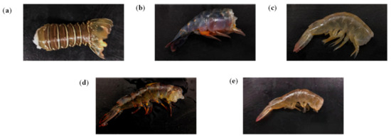 Photos of five different shrimp species. (a) Panulirus argus; (b) Macrobrachium rosenbergii; (c) Penaeus chinensis; (d) Penaeus japonicus; and (e) Metapenaeus ensis.