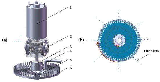 (a) Main structure of centrifugal atomizer (1. motor, 2. bevel gear commutator, 3. rotating disc flange, 4. pipeline, 5. slotted rotating disc, 6. toothed rotating ring); (b) schematic diagram of the centrifugal atomizer atomization process.