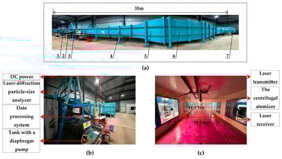 Wind tunnel used in the droplet-size test experiment. (a) Form and structure (1. observation window, 2. droplet-size testing system, 3. test section, 4. mounting bracket, 5. contractive segment, 6. steady section, 7. drive section); (b,c), the droplet test system and spraying system.