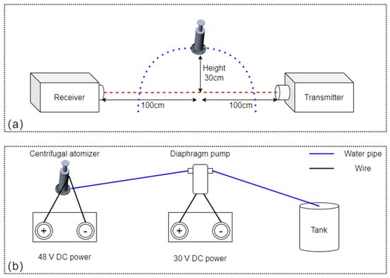 Schematic diagram of the droplet testing system (a) and spraying system (b).