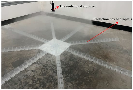 The centrifugal-atomizer spray-width test was conducted in the laboratory under windless conditions (Figure 4). The droplet collection boxes were placed in eight directions below the atomizer (east, southeast, south, southwest, west, northwest, north and northeast). Under windless conditions, there were no droplets in the central part of the deposition area of the centrifugal atomizer; therefore, no droplet collection box was placed in the central area. Due to the large number of tasks for collecting and weighing droplets, 9.3 cm × 9.3 cm square plastic boxes were used. The spraying system was the same as that of the above droplet-size test. The spray height (1–3 m) was controlled by the lifting rod of the atomizer’s support stand. For each test group, after atomizer spraying for 3 min, the outside of each box was wiped using dry towels, and then the droplet mass of each box was weighed. Finally, according to the droplet distribution, the spray width corresponding to D50 in each direction was calculated, and the ESW of each group was obtained as its average value of eight directions.