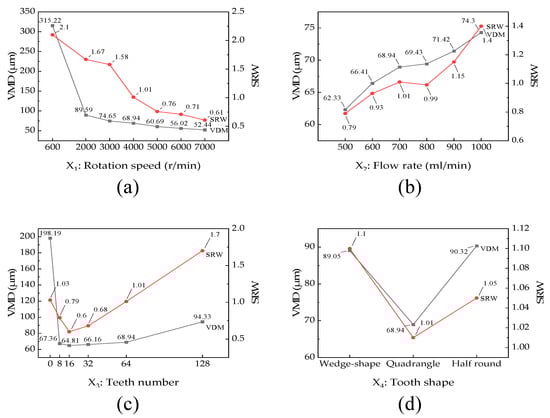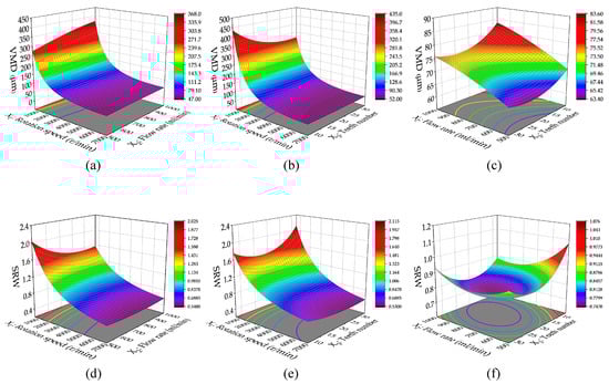 The response surface plots of VMD and SRW and the corresponding contour plots are shown in Figure 7. Each response surface plot represents the effect of two independent variables with the values of the other variables kept at the 0 level; the shape of the corresponding contour plot indicates whether the interaction between the independent variables was significant. The interactions of rotation speed () and flow rate (), rotation speed () and tooth number (), and flow rate () and tooth number () on VMD are shown in Figure 7a–c, respectively; the interactions of rotation speed () and flow rate (), rotation speed () and tooth number (), and flow rate () and tooth number () on SRW are shown in Figure 7d–f, respectively.
