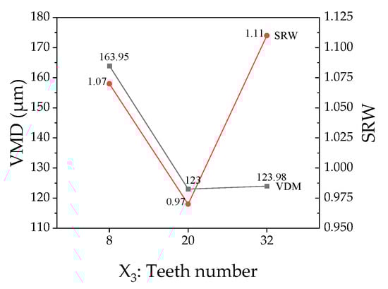 The quadratic regression models of VMD and SRW were obtained by analyzing the Box–Behnken test results using Design-Expert 11 software. The ANOVA results of the quadratic regression models are shown in Table 9. Here, p-values < 0.01 for the VMD and SRW regression models indicated that the regression equations for VMD and SRW were highly significant. The p-values for lack of fit were 0.0705 and 0.0878 (>0.05), respectively, indicating that the actual fit and the regression equation had a small proportion of abnormal errors and were well-fitted. The variation coefficients CV were 2.21% and 4.63%, respectively, indicating good test reliability. The determination coefficients, , were 0.9976 and 0.9770, respectively, and the calibration determination coefficients, Adj , were 0.9945 and 0.9474, respectively, indicating good reliability of the regression equation. The Adeq precision results were 53.2 and 17.47, respectively, indicating good accuracy of the regression model. Therefore, the developed models can be regarded as a reliable representative of the experimental results. In addition, all primary terms, , and , and secondary terms, and , had a significant effect on VMD, and the other terms had no significant effect on VMD. The primary term, , and secondary terms, and , had a significant effect on SRW, and the remaining terms had no significant effect on SRW. After fitting the regression to the experimental results, the regression equations of VMD and SRW with rotation speed (), flow rate () and tooth number () as variables were obtained as shown in Equations (2) and (3), respectively.