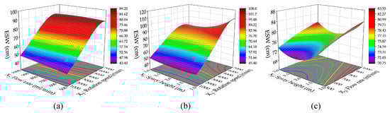 Response surface plots of the corresponding models were generated using Design-Expert 11 software, as shown in Figure 9, demonstrating the interaction between the rotation speed, ; flow rate, ; and spray height, on ESW.