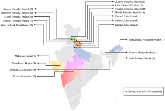 The seed materials of 94 diverse grain amaranth accessions belonging to different Indian states (Himachal Pradesh (42), Uttarakhand (23), Uttar Pradesh (1), Madhya Pradesh (3), Arunachal Pradesh (1), Maharashtra (7), and Gujrat (10)) and four exotic accessions (USA (3) and Russia (1)) were obtained from the National Gene Bank, ICAR-National Bureau of Plant Genetic Resources (NBPGR), New Delhi, as depicted in Figure 1 and Table S1. The seeds were sown in the greenhouse at ICAR-NBPGR in three-dimensional seedling trays with 18 cavities, with each cavity having dimensions of 8 cm × 8 cm × 8 cm.