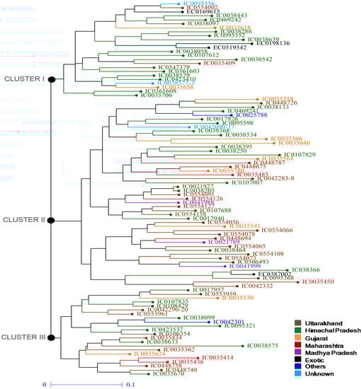 The percentage of polymorphic loci across all the studied accessions was 85.42%. Within the accessions, polymorphic loci percentages ranged from 63.89% to 100.00%. The maximum values of polymorphic loci were detected in accessions from Himachal Pradesh (100%) and with exotic origins (80.56%). The highest values of Shannon’s information index (I) (0.883) and expected heterozygosity (He) (0.497) were observed in the population from Himachal Pradesh indicating high genetic variability in accessions from Himachal Pradesh. The maximum value of observed heterozygosity (Ho) (0.583) was recorded in accessions belonging to Madhya Pradesh and with exotic origins (Table 2).