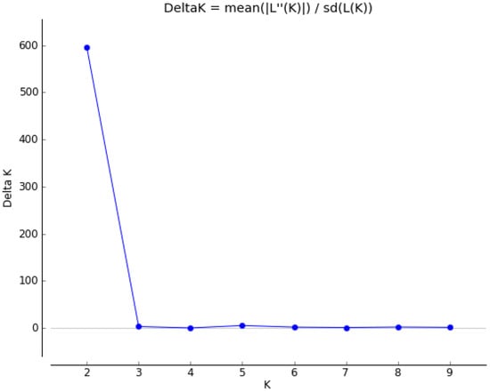 Value of Delta K (ΔK) for determining the optimum number of subpopulations.