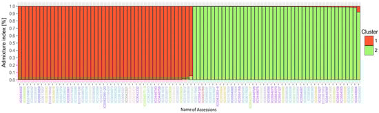The model-based population structure analysis of the 94 studied accessions revealed the presence of two different genetic populations. The maximum value of ΔK was recorded at ΔK = 2, which corresponded to the most possible number of populations in the study (Figure 3). The accessions with a probability score of >0.80 can be considered as genetically pure accessions, while those with a probability score of <0.80 can be considered as admixture. The grouping of amaranth accessions is illustrated in the bar plot diagram obtained using Structure Harvester (Figure 4). Population I contained 46 accessions and population II comprised48 accessions without any admixture. Population I comprised twenty-five accessions from Himachal Pradesh, seven accessions from Uttarakhand, six accessions from Maharashtra, four accessions from Gujarat, two accessions from the USA, and one accession each from Uttar Pradesh and Russia, along with two accessions belonging to an unknown location. Population II included seventeen accessions from Himachal Pradesh, sixteen accessions from Uttarakhand, six accessions from Gujarat, three accessions from Madhya Pradesh, one accession each from Maharashtra, Arunachal and USA along with one accession of unknown origin. If we compare the grouping of population structure with the neighbor-joining tree, Population I correspond to Clusters 1 and 3 of the neighbor-joining tree, whereas population II corresponds to Cluster 2. This shows that the neighbor-joining tree and population correspond to each other. The only difference is that clusters 1 and 3 are becoming merged together in population 1 during structure analysis.
