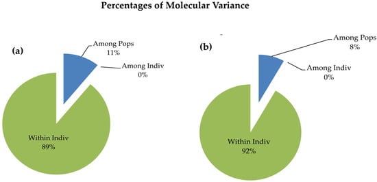 The Analysis of Molecular Variance (AMOVA) was first performed based on geographic populations and then based on the two populations as obtained by the model-based population structure analysis. The genetic variance recorded between the subpopulations in origin-based AMOVA was 11%, whereas within the individuals, 89% variance was recorded (Figure 5a and Table S3). The model-based AMOVA displayed a genetic variation of 8% between the two obtained subpopulations, and a variation of 92% was found within the individuals (Figure 5b and Table S4). There was no significant difference observed among the origin-based and model-based AMOVA analysis.