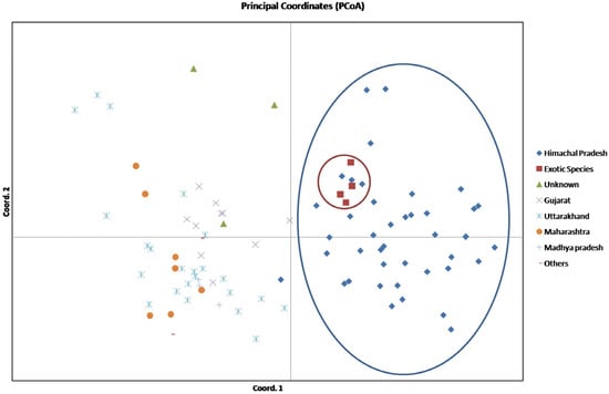In addition, the principal coordinate analysis (PCoA) plot displayed the existence of a significant amount of molecular diversity among the analyzed amaranth accessions. The first three axes of the PCoA accounted for a cumulative variation of 27.7%, wherein the first, second and third axes expressed 11.7%, 8.51%, and 7.48% of the total variation, respectively (Table 3). Furthermore, in the PCoA matrix, the amaranth accessions were distributed across the coordinates represented with different colors. The PCoA analysis clearly indicates that accessions from Himachal Pradesh were very distinctly isolated from other states accessions. Similarly, the exotic accessions shared more similarity among themselves and were very close to Himachal Pradesh accessions (Figure 6), whereas accessions from Uttarakhand were more diverse and shared genetic similarity with accessions from Maharashtra, Gujrat, and Madhya Pradesh.