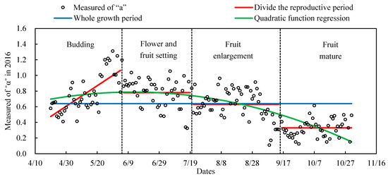 - After improving the calculation method of “α” by using either linear fitting for different growth periods (P–Ta) or a quadratic function over the entire growth period (P–Tb), the R2 of the P–T model increased from 0.62–0.74 to 0.74–0.83. Both of the improved models provided good simulations of jujube evapotranspiration. Simulation accuracy was slightly higher for P–Ta than for P–Tb.