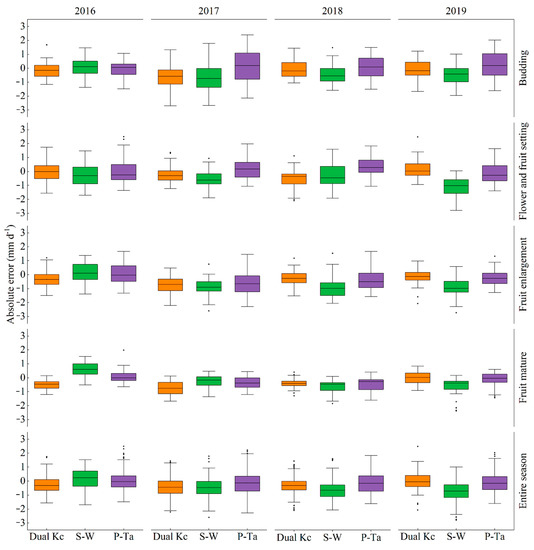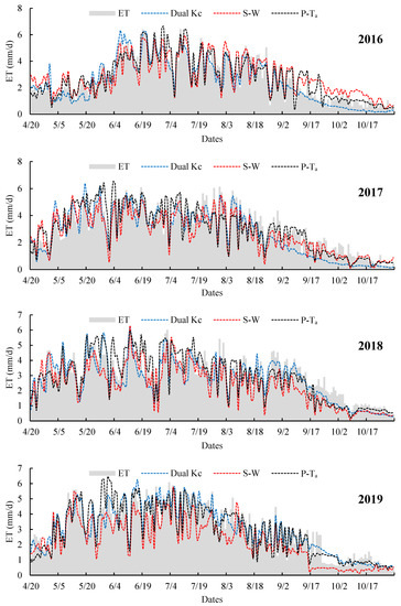 - Through our comprehensive evaluation of these three ET models we conclude that the simulation abilities of the Dual Kc model and P–Ta model were similar, and slightly better than the S–W model. The simulation effect grade for the Dual Kc model was “Excellent” during the four years of the study, and the simulation stability was higher than that observed for the P–Ta model. The P–Ta model was easily affected by changes in net radiation and air temperature due to the few formula parameters. Therefore, the Dual Kc model had better performance than the S–W model and the P–Ta model in estimating jujube ET and could be recommended to estimate jujube ET.