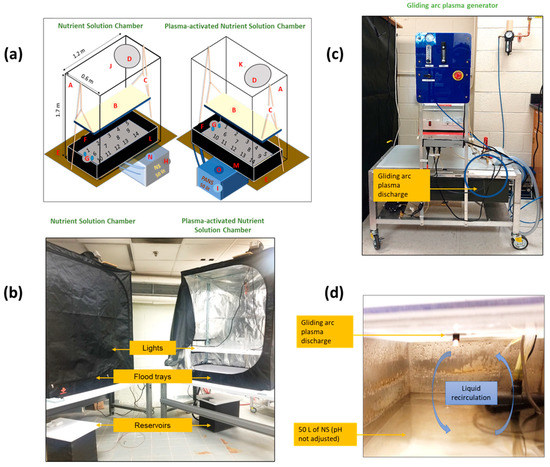 Figure 1. Experimental setup: (a) Diagram of growth chambers where A—enclosed chambers; B—white fluorescent lights; C—adjustable ropes for lights; D—fans; E—tables for chambers; F—flood tray showing placements of 14 basil plants; G—inlet and outlet pipes from the reservoir to the flood tray; H—NS reservoir; I—PANS reservoir; J, K—CO2 sensors; L, M—temperature and relative humidity sensors; N, O—temperature sensors. (b) Picture of enclosed chambers. (c) Picture of the gliding arc plasma generator. (d) Schematic of plasma treatment of NS by gliding arc plasma discharge inside the equipment.