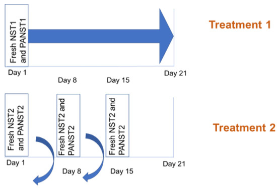 Figure 2. Schematic representation of experimental treatments based on the irrigation of PANS, where PANST1 indicates irrigation of basil seedlings with the same PANS throughout the complete growth cycle (Treatment 1), and PANST2 indicates irrigation of basil seedlings with newly prepared PANS at the beginning of each week (Treatment 2).