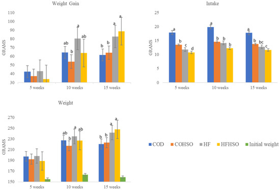 The COD group intake was the highest among all groups during the trial period (p ≤ 0.05). At week 5, body weight gains and body weight did not differ among all the treatment groups. However, at week 10, weight gains and body weights were greater (p ≤ 0.05) for the HF group than COHSO. At the end of the trial (i.e., week 15), weight gains and body weight were higher (p ≤ 0.05) for the HF and HFHSO groups compared with the COD and COHSO groups (Figure 1).