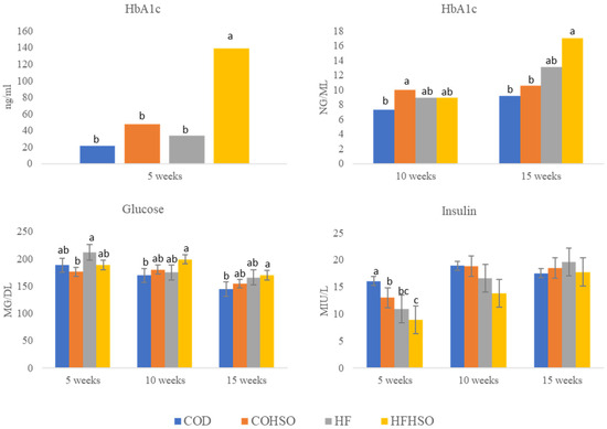 Only at week 5 was there a significant difference (p ≤ 0.05) between the HF and COHSO groups regarding random glucose concentration. However, there was a statically significant difference between the HFHSO and COD groups at 10 and 15 weeks (p ≤ 0.05). At week 5, insulin concentration showed a significant difference between all groups, except for the HF and HSO-supplemented groups (p ≤ 0.05). Also at week 5, HbA1c concentration showed statically significant differences between the HFHSO group and all other groups, as well as again at week 15 (p ≤ 0.05). A statically significant difference was observed at week 10 between the COHSO and COD groups (p ≤ 0.05, Figure 3).