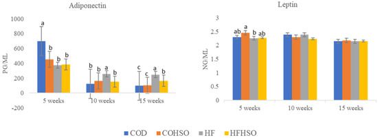 As shown in Figure 4, there were no statically significant differences (p > 0.05) between any group in leptin concentration, except in week 5, when a significant difference (p ≤ 0.05) was observed between the COHSO and HF groups. Adiponectin concentration showed statically significant differences (p ≤ 0.05) between the COD group and all groups at week 5. At weeks 10 and 15, statically significant differences were observed between the HF group and all other groups (p ≤ 0.05, Figure 4).