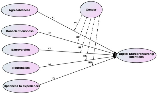 In studying human behavior, the available literature has given gender variations in personal traits a lot of attention [66]. However, investigations have shown contradictory results in relation to the effect of this on becoming entrepreneurs [27]. In general, women reported high levels in the negative affectivity scale and can change their moods more quickly than men from a psychological point of view [70]. Vedel [71] conducted a meta-analysis on gender variances in relation to personality traits and found that women reported higher levels of conscientiousness, agreeableness, and neuroticism but no significant differences regarding openness and extraversion. Other researchers have found that women tend to be more agreeable than men, have higher levels of neuroticism [72,73], are more extroverted [70,74], and are more open to experiences [74]. However, men have also been discovered to be more conscientious [74] and open to experiences than females [49]. Women scored higher in agreeableness and conscientiousness than men [75]. Similarly, Bajwa et al. [66] indicated that the difference between men and women in terms of the influence of various personality traits on cognitive adaptation is mostly related to two personality factors, namely extraversion and neuroticism. However, other researchers [43,76] did not distinguish personal traits based on gender in the field of entrepreneurial intention, believing that possibilities of success are not based on gender. Laouiti et al. [27] argued that female students want a combination of attributes with lower degrees of agreeableness and neuroticism to control predominance of such traits if they are willing to engage in entrepreneurial activity. This reasoning supports research that indicates that low agreeableness and low neuroticism remain essential indicators of entrepreneurship intent. A recent study on the effects of role models and gender on freshman students’ entrepreneurial intention in KSA [77] showed that females are more infunced by subhective norms and perceived behavioral control than males. Hence, gender was found to moderate the effect of subjective norms and perceived behavioral control on entrepreneurial intention of senior students in KSA. The current study intended to examine whether gender moderates personality traits and student intention to become entrepreneural links (see Figure 1).