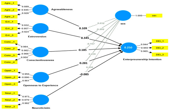 This study tested the influences of personality traits on agricultural and food science students’ DEI in a Saudi context. The study tested the moderating effect of gender in this relationship, which has not been examined before. The findings of PLS-SEM showed that four out of personal traits have a significantly and positively impact on agricultural and food science students’ intent toward digital entrepreneurship. The most significant predictor of entrepreneurship among agricultural and food science students’ was extraversion, followed by openness to experiences, conscientiousness, and finally agreeableness. Only neuroticism has a negative influence, though not a significant one, on agricultural and food science students’ DEI. For the first attempt, the moderating role of gender on the relationship between the traits and digital entrepreneurship intention was examined. There were no significant moderating influences of gender on the link between two traits, i.e., agreeableness and neuroticism and entrepreneurship intention. On the other hand, gender had a significant moderation role on the link between the four other traits: extraversion, conscientiousness, openness to experiences, and entrepreneurship intention. Interestingly, males have a more moderating influence in relation to extraversion and conscientiousness than females on entrepreneurship intention, which means these two traits are more prominent in male agricultural and food science students than females and allow them to engage in entrepreneurship. Nonetheless, females have a more moderating influence in relation to openness to new experiences than males on their entrepreneurship intention. This could be because women have been recently empowered in Saudi Arabia; hence, they would like to express themselves and are more open to entrepreneurship experiences than men, especially in the food industry, which is more relevant to them [94].
