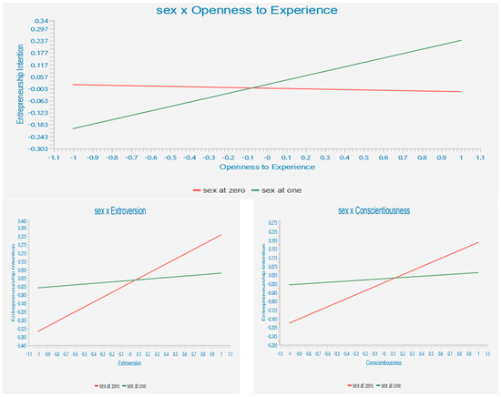 On the other hand, gender had a significant moderation influence on the extroversion-DEI link (H7). It was found that male students have higher the moderating impact than the females. This could be because men are dominant in the Saudi culture, so they tend to become more extroverted than women, which has influences their entrepreneurial intentions [3]. This finding contradicts the work of other researchers in other countries’ contexts, mainly in Western countries with different cultures [70,74] where women tend to be more extroverted than men. Furthermore, gender had a significant moderation influence on the conscientiousness-DEI link (H9), where the moderating impact on the male side was higher than the moderating impact on the female side. This confirms that males students have more conscientious traits than females do [74]; hence, this affects their entrepreneurial intentions. This contradicts other assumptions that women scored higher in conscientiousness than men [75].
