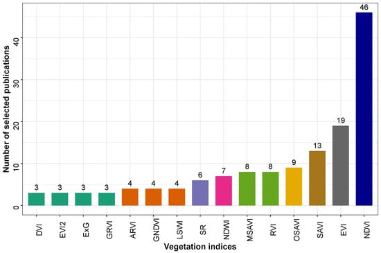 Vegetation indices versus the number of selected publications collected from database sources. Frequency of use of vegetation indices is sorted from lowest to highest. NDVI—normalized difference vegetation index, EVI—enhanced vegetation index, SAVI—soil-adjusted vegetation index, OSAVI—optimized soil-adjusted vegetation index, RVI—relative vigor index, MSAVI—modified soil-adjusted vegetation index, NDWI—normalized difference water index, SR—simple ratio, LSWI—land surface water index, GNDVI—green NDVI, ARVI—atmospherically resistant vegetation index, GRVI—green and red ratio vegetation index, ExG—excess green, EVI2—2-band EVI, and DVI—difference vegetation index.