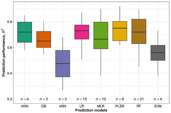 Box plot of prediction performance () for the eight most-used regression and machine learning methods. ANN—artificial neural network, GB—gradient boosting, kNN—k-nearest neighbor, LR—linear regression, MLR—multiple linear regression, PLSR—partial least squares regression, RF—random forest, and SVM—support vector machine.