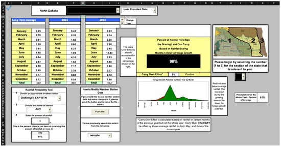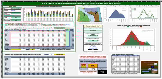 The North Dakota Drought Calculator (NDDC) is a spreadsheet-based linear decision tool developed by the United States Department of Agriculture (USDA) Agricultural Research Service (ARS) and the USDA Natural Resources Conservation Service (NRCS) to predict the effect of drought on forage production [16]. The NDDC uses linear regression models of average monthly precipitation to predict the forage growth potential (FGP) based on generic forage/biomass growth curves for specific zones. This tool is intended for farmers and ranch managers to aid in early stocking decisions during droughts (Figure 5). The FGP represents the above-ground forage biomass during the growing season, and is measured using the peak standing crop factor [17]. The calculator tool was developed and evaluated using data from the Great Plains of Colorado, North Dakota, and Wyoming. The overall accuracy of the NDDC tool, applicable to North Dakota, was determined to be approximately 75% [16].
