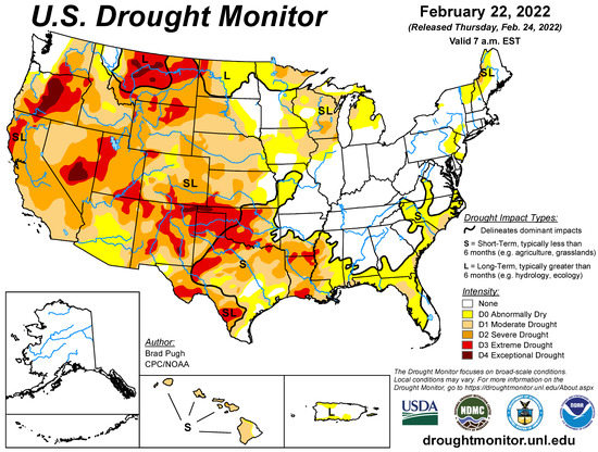 US Drought Monitor map categorized into abnormally dry (D0), moderate (D1), severe (D2), extreme (D3), and exceptional (D4). Accessed 24 February 2022.