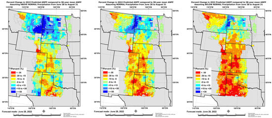 Grass-Cast maps of above-ground net primary productivity (ANPP) with scenarios for precipitation above normal (left map), near normal (middle map), and below normal (right map). Map archive data of Great Plains for date 28 June 2022.