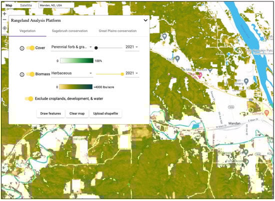 The Rangeland Analysis Platform (RAP) is a free online interactive tool that provides rapid access to geospatial data from United States rangelands (Figure 9). The RAP is a collaborative product of the University of Montana, the Department of Interior Bureau of Land Management, and the USDA—Natural Resources Conservation Service [22]. The target audience of this tool is anyone looking to make a land management decision based on the changes in vegetation cover and productivity, including ranchers, landowners, managers, and conservationists.