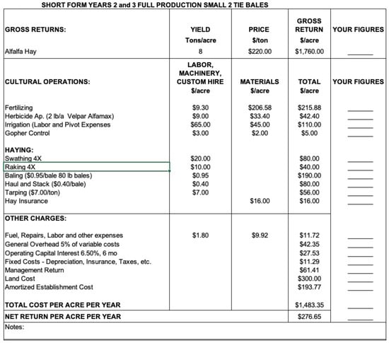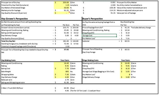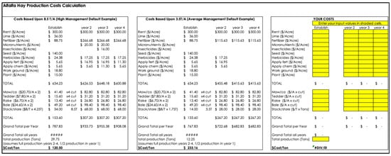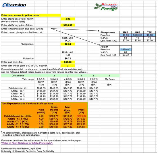 Based on a research trial conducted at the University of Wisconsin-Extension establishing that short rotations of alfalfa were more profitable than long-term rotations, a spreadsheet-based calculator was developed [24]. This economic analysis tool was designed using fixed and variable costs (including machinery operation and land rent) of a four-year stand alfalfa crop (Figure 10), and study results were incorporated into a calculator where inputs include factors such as alfalfa yield, price, fertilizer cost, and land rent cost [25]. The costs of alfalfa production from years one to four are provided in the calculator as default choices to calculate the profit.