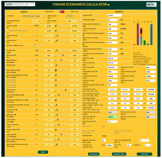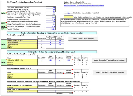 The Montana State University Extension developed a detailed calculator to determine the operating and ownership cost of different haying systems for alfalfa [26]. The general inputs of the tool include total acres of hay grown, estimated yield, cuttings per year, number of machine operations per year, and fuel price (Figure 11). In addition, other specific machinery information (speed, field efficiency, type of fuel, and percent utilized) for tractors, swathers, rakes, bailers, and hauling equipment is collected as input to calculate the machine cost per ton, and the operating and ownership costs. The tool also generates enterprise budgeting for irrigated alfalfa hay establishments. The inputs and the generated results are printable for future use.