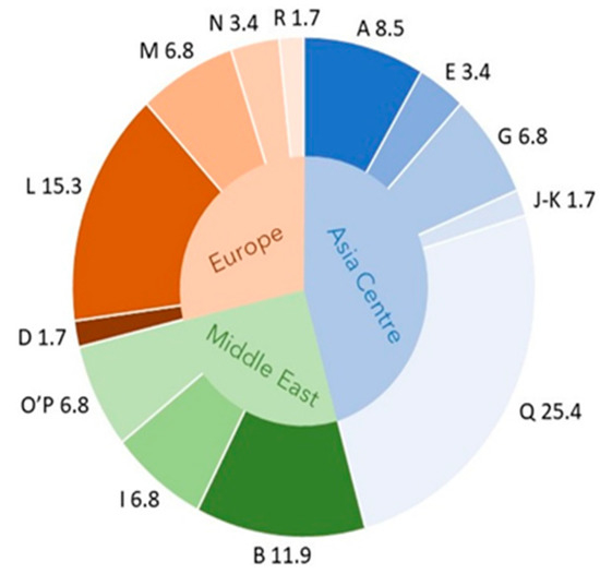 | Haplogroups | Asia Centre n, % | Middle East n, % | Europe n, % | Szekler Horse n(♂), % | ||||