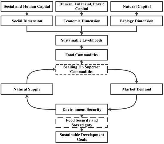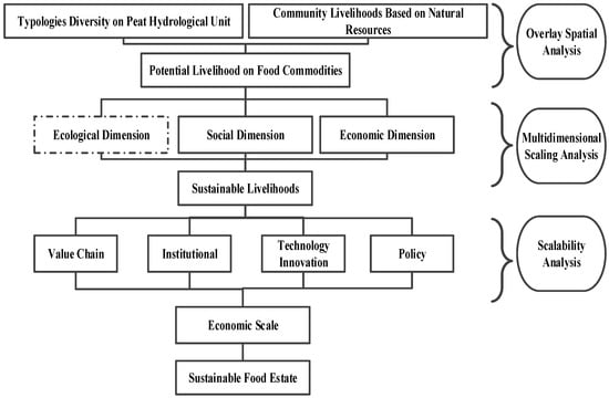 In addition, food commodities must be produced by the communities around sustainable peat ecosystems to ensure consistent supply. For this reason, this research proposes scaling up to transform food commodities that can meet market needs. Massive peatland interventions do not perform scaling to cultivate certain food commodities, rather it focuses on sustainable livelihoods. Therefore, the present research adopts an environmental livelihood security framework [81], modified with the scaling-up concept to become more implementable (Figure 1).