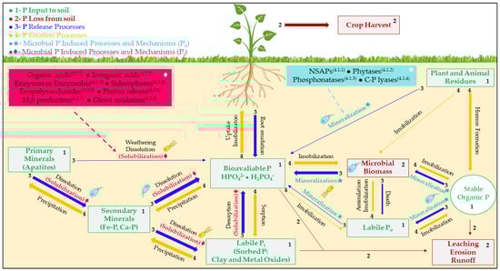 Phosphate-solubilizing microorganisms have several mechanisms to increase the availability of this element in the soil. Figure 1 brings together the mechanisms and processes involved in the nutrient dynamics in the soil and the various interactions with the microbiota. The main roles of microorganisms in P solubilization include (1) the release of extracellular enzymes (biochemical mineralization), (2) the release of P during substrate degradation (biological mineralization), and (3) the secretion of mineral-dissolving complexes or compounds (siderophores, protons, hydroxyl ions, organic acids) [28,71].