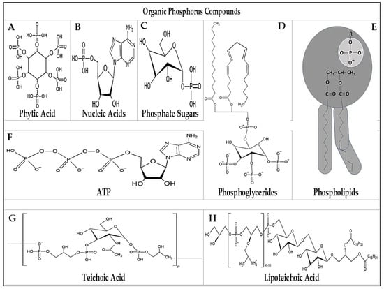Organic phosphate corresponds to 20–30% of the total amount found in the soil [28]. Its main source of entry into the environment is biomass, being present in animal and plant debris, and in microbial cell membranes, that is, they constitute biomolecules such as phosphides, nucleotides, phosphoproteins, co-enzymes, sugar phosphates, phosphonates and can be immobilized in the form of humus [75,76,77]. Figure 2 shows some organic molecules that contain phosphorus in their composition.