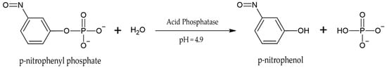 NSAPs are a class of enzymes bound to the lipoprotein membranes of microorganisms or secreted extracellularly [78,79]. Also known as phosphomonoesterases, they act according to the optimal pH of the environment, and can therefore be acidic or alkaline [80,81]. These enzymes can dephosphorylate a wide variety of phosphoesters (RO–PO3), solubilizing around 90% of organic phosphate in soils [82,83]. Figure 3 shows how the catalytic reaction of NSAFs occurs.