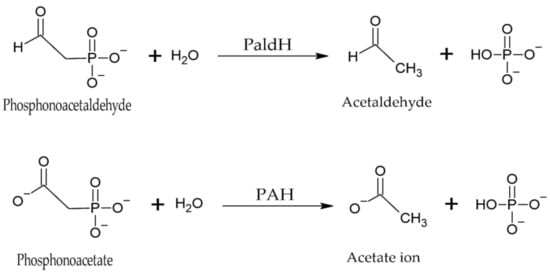 Phosphonates are organic phosphoric compounds rich in hydrolytically stable C–P bonds that are chemically inert and resistant to thermal and photolytic decomposition [90,91]. The enzymes that promote the breaking of this bond are known as phosphatases (phosphonate hydrolases) and act by catalyzing this reaction from a group β-carbonyl electron scavenger that allows heterologous cleavage between nutrients [91]. Phosphonatases act on several substrates, including phosphoenolpyruvate, phosphonoacetate, and phosphoenol-acetaldehyde. Figure 5 shows the mechanisms of phosphonatases.